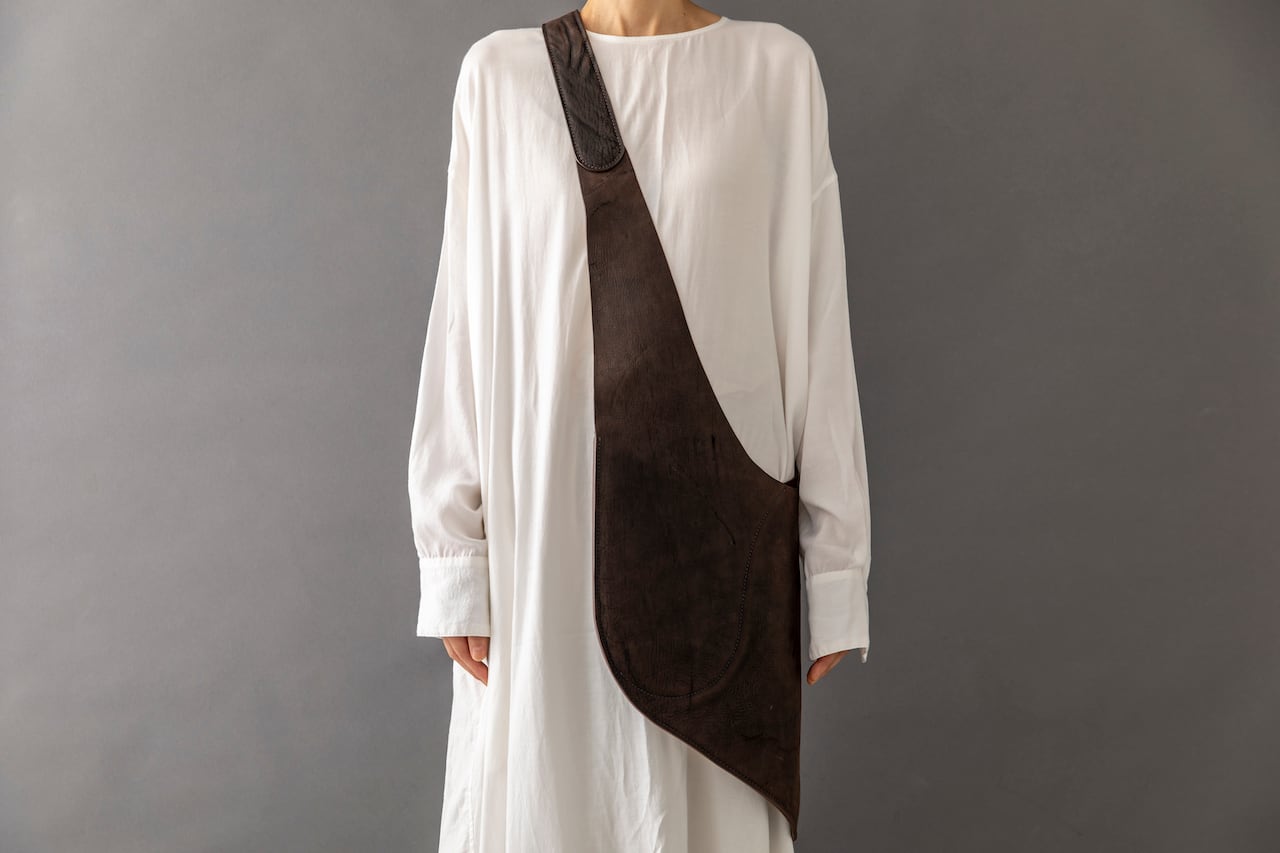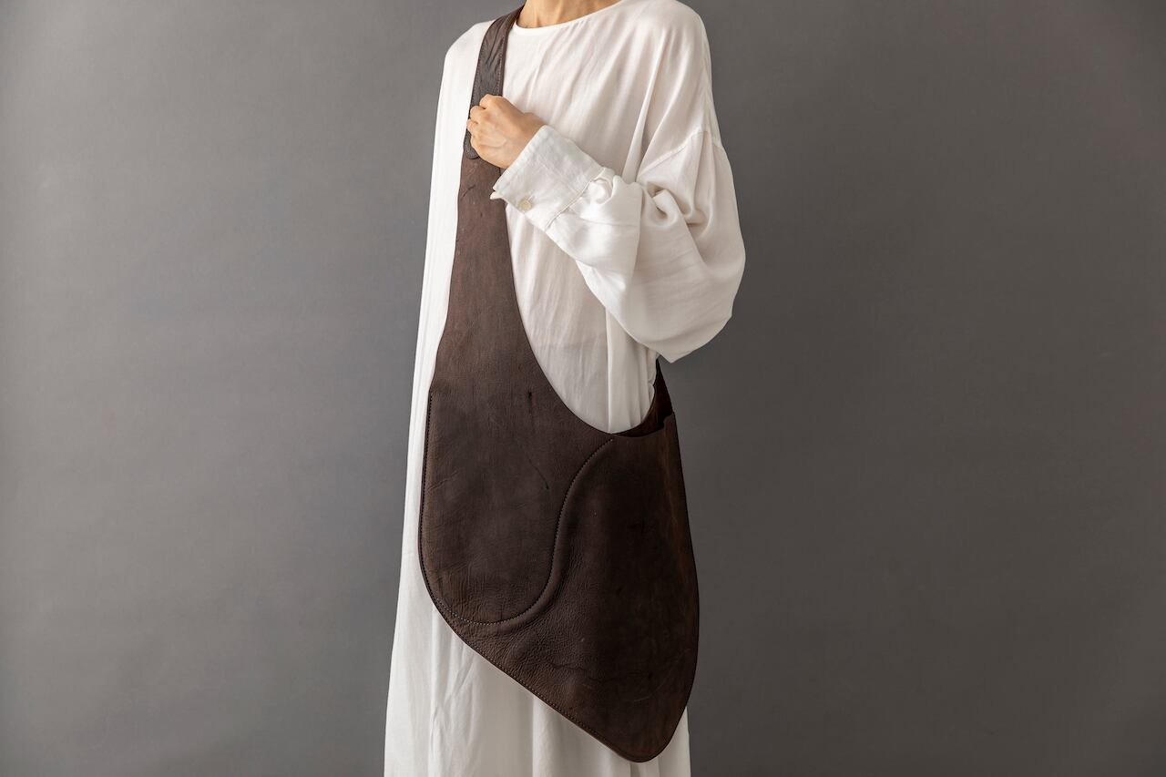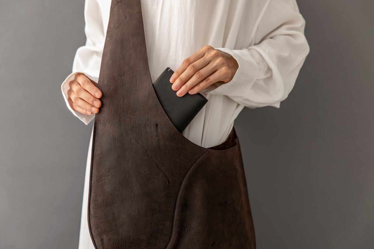 底のラインを斜めにすることで内側についているポケットと逆側に物が流れ、腰のラインで自然に曲がり体にフィットする構造